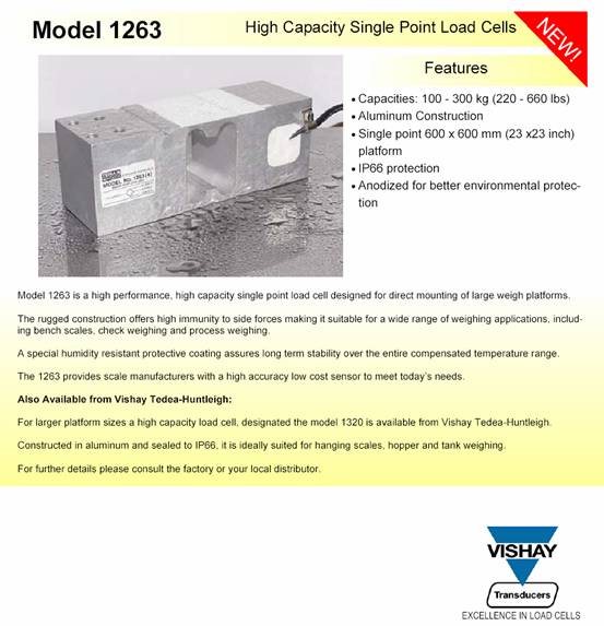 描述:1263是為大尺寸平臺秤設計的直接安裝的高性能高量程單點式傳感器。這個結(jié)構(gòu)保障了高的抗偏載能力,使得1263有廣泛的應用領域,包括臺秤、分選秤、吊掛式電子秤和過程稱重。