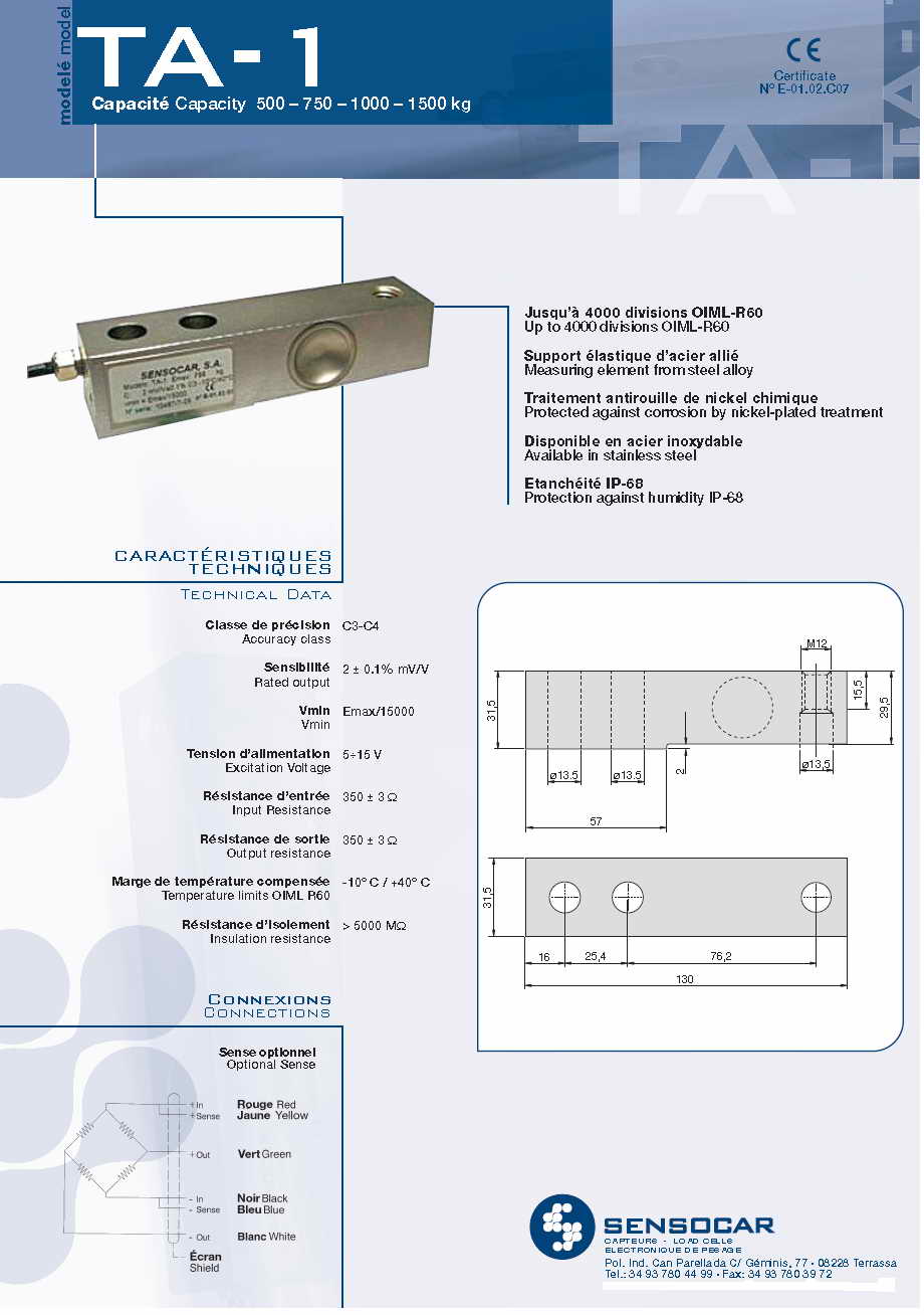 | 產品名稱:Sensocar TA-1 懸臂梁式稱重傳感器(load cells) |